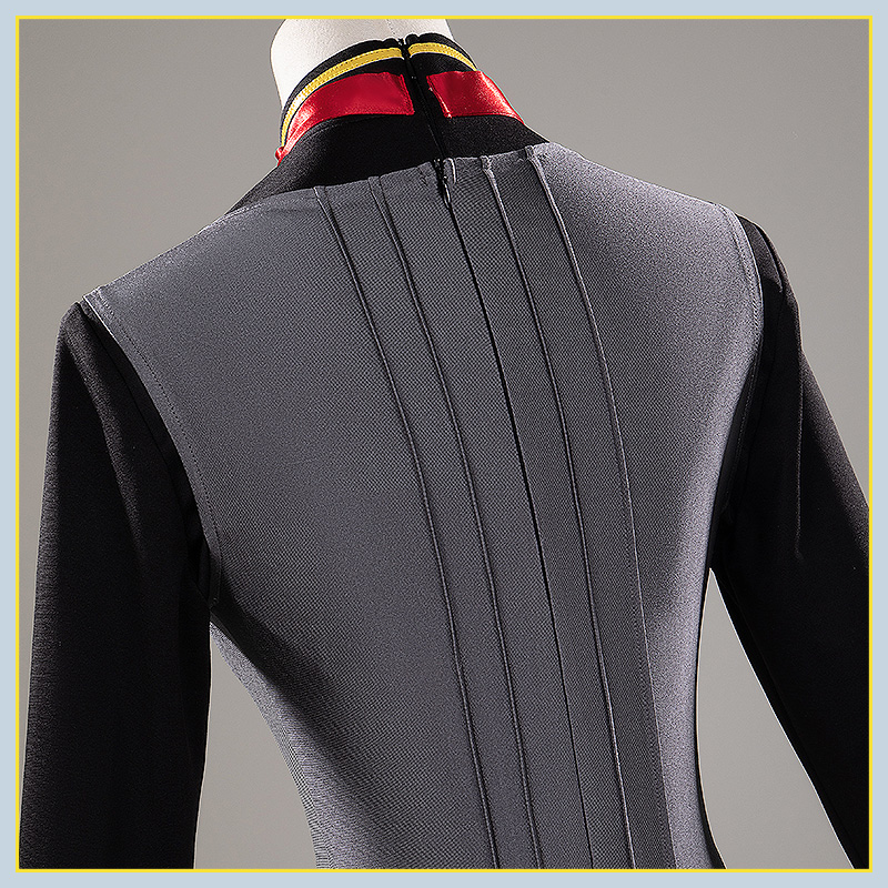 ニットで製作しています。高めの襟元に赤いリボンタイが付き、中央に金色の星型ブローチが輝く。袖口はフリル状に広がり、可愛らしさとフォーマルさを両立。