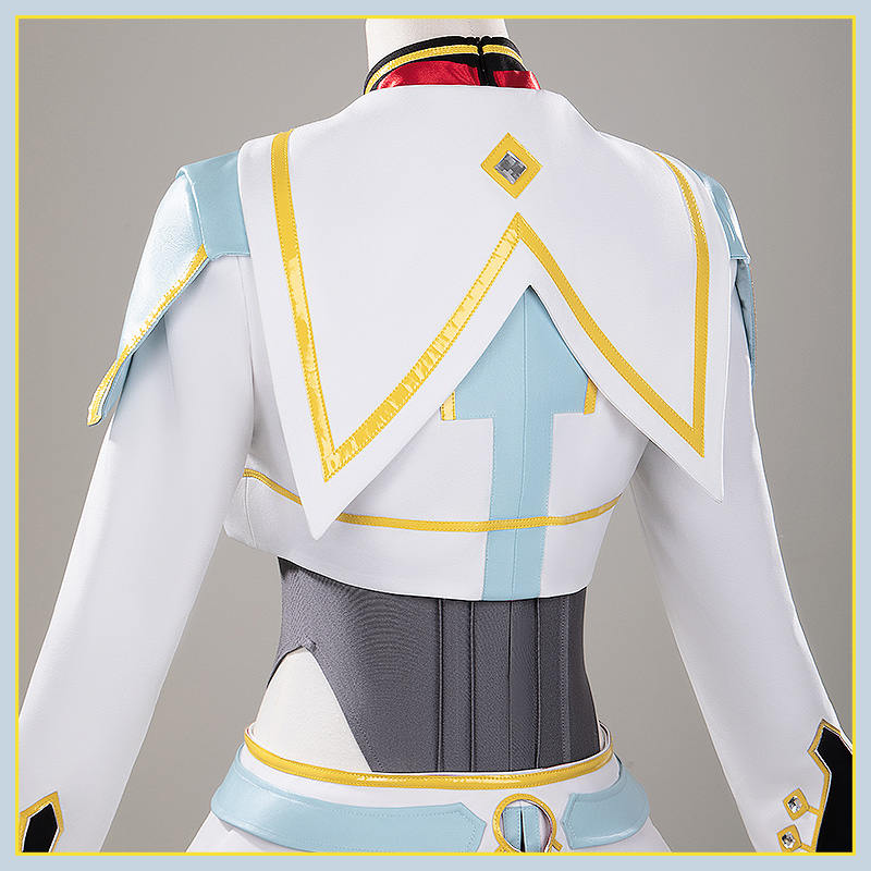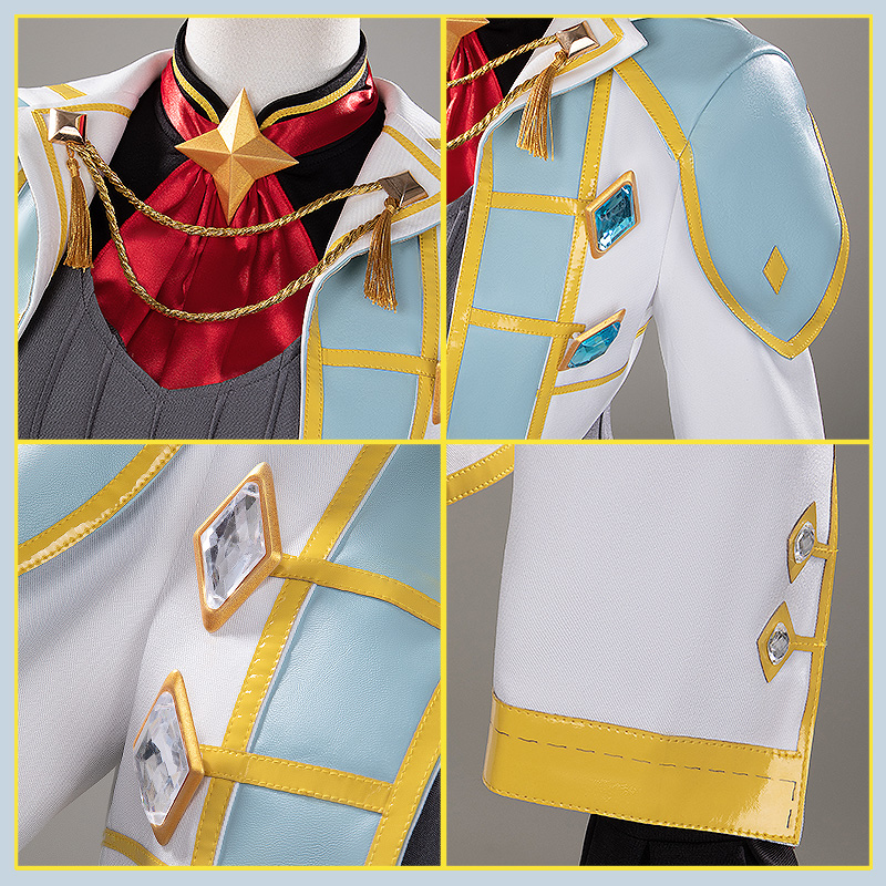 TRサージで製作しています。白を基調としたテールコート風ジャケット。肩には水色のエポーレットが付き、金色の縁取りと菱形の装飾が施されている。胸元には金色のチェーンが横断し、タッセルが揺れるデザイン。
