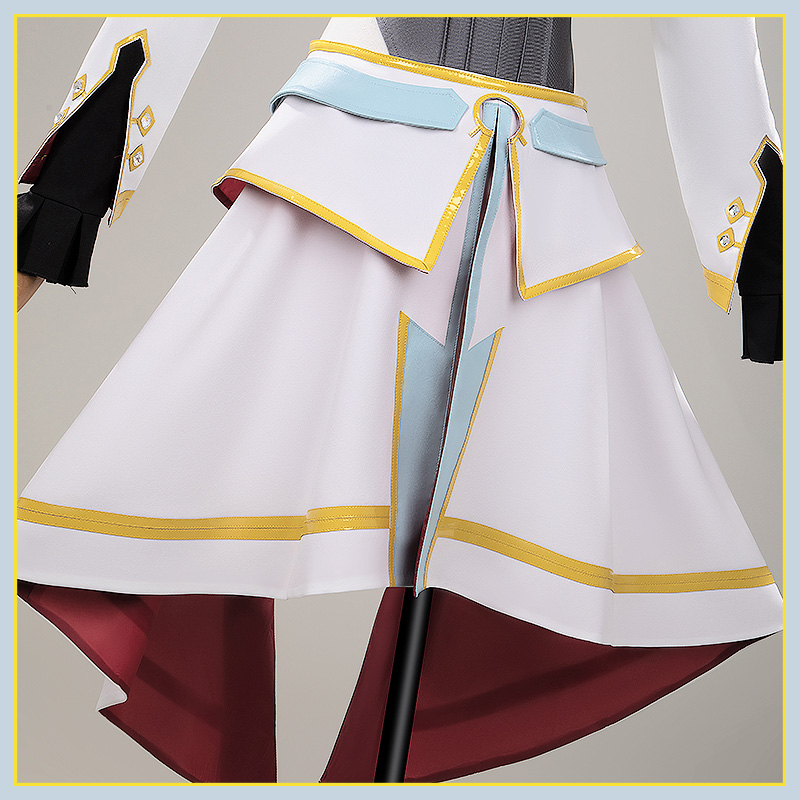 TRサージで製作しています。白い生地にキュロットスカート。前後の裾は尖ったカットで、腰回りには水色のベルト風パーツと金色の菱形装飾が配置されている。