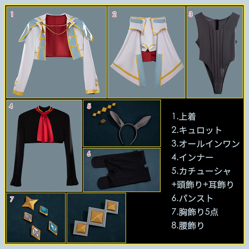 上着、キュロット、オールインワン、インナー、飾り物(カチューシャ、頭飾り、耳飾り、パンスト、胸飾り5点、腰飾り)