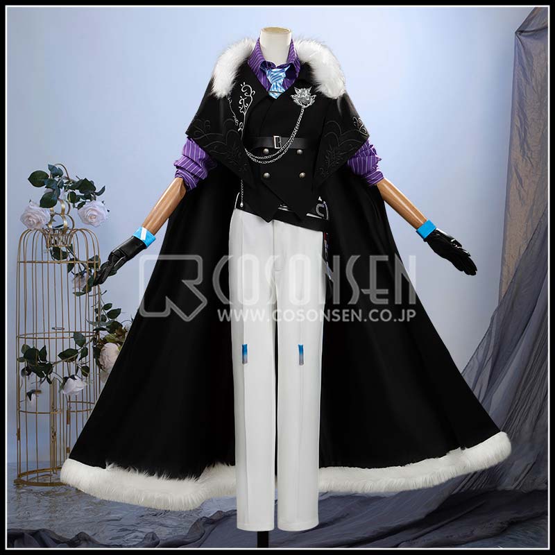 TRサージで製作しています。黒いベストはアシンメトリーなデザインで、ボタンが片側に並び、狼モチーフのブローチやチェーンがアクセントとなっています。
