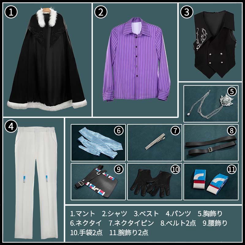 マント、シャツ、ベスト、パンツ、飾り物(胸飾り、ネクタイ、ネクタイピン、ベルト2点、腰飾り、手袋2点、腕飾り2点)