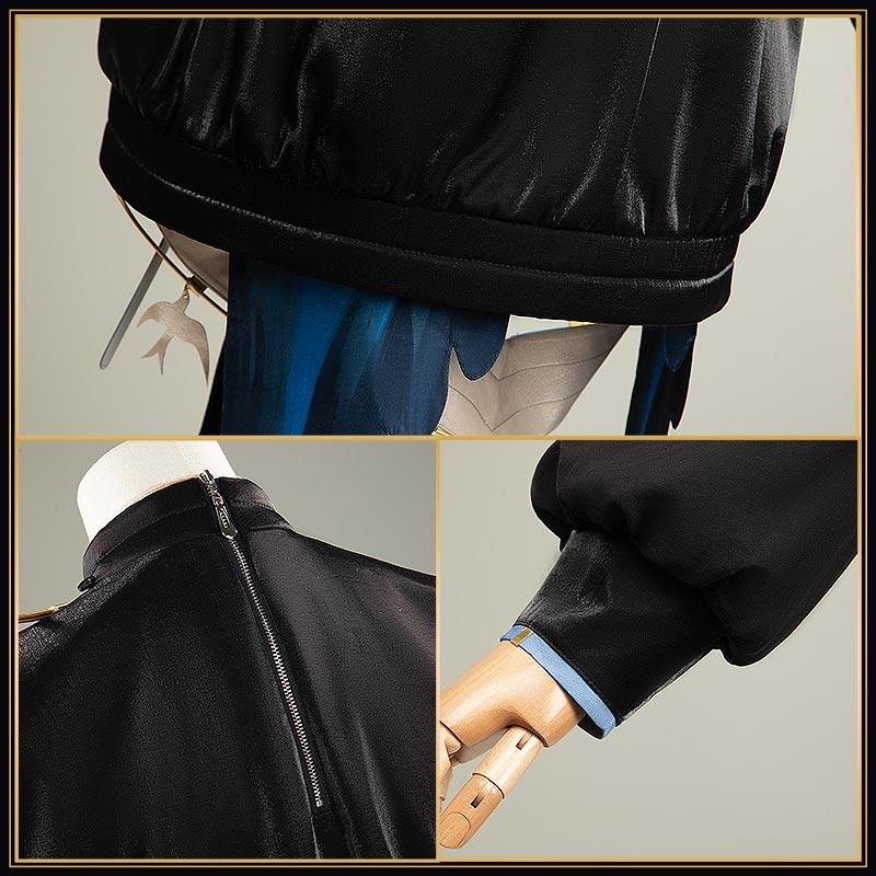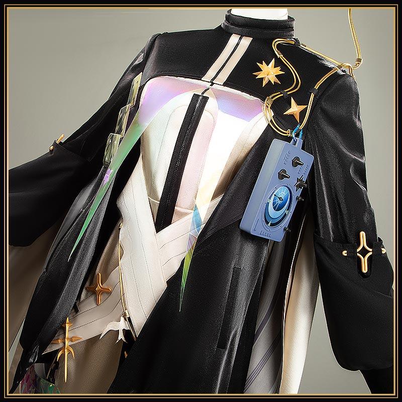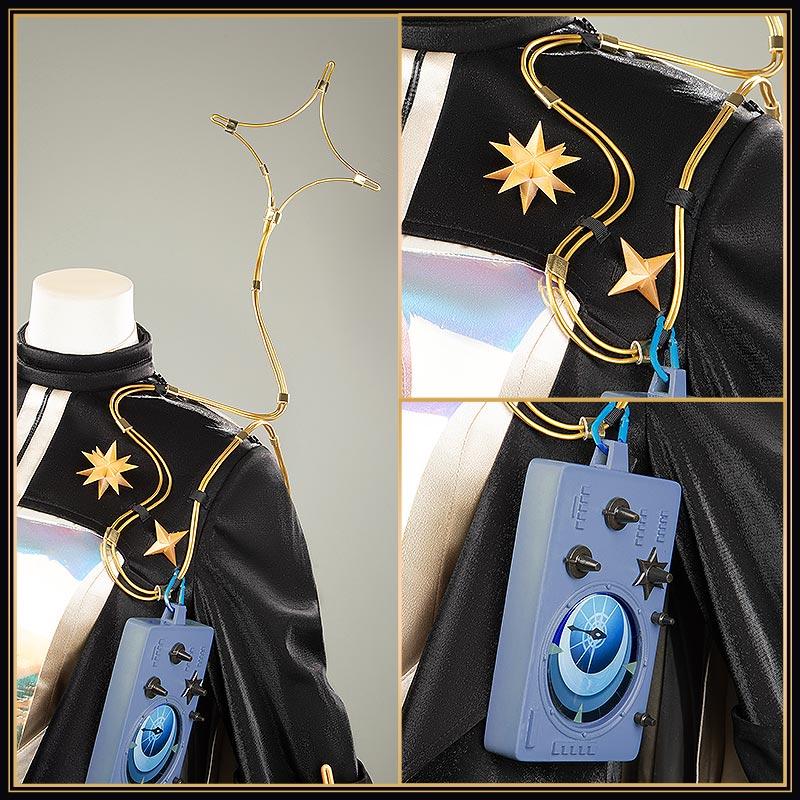 光沢布で製作しています。高めのスタンドカラーが特徴で、左肩から伸びる金色の曲線的な星型アンテナが目を引き、金色の星型エンブレムが配置。