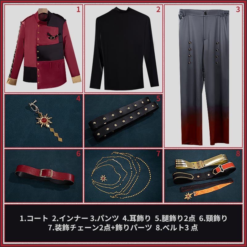 コート、インナー、パンツ、飾り物(耳飾り、腿飾り2点、頸飾り、装飾チェーン2点、飾りパーツ、ベルト3点)