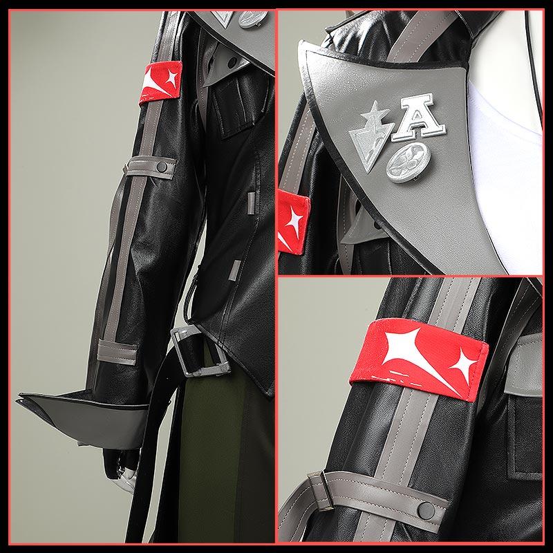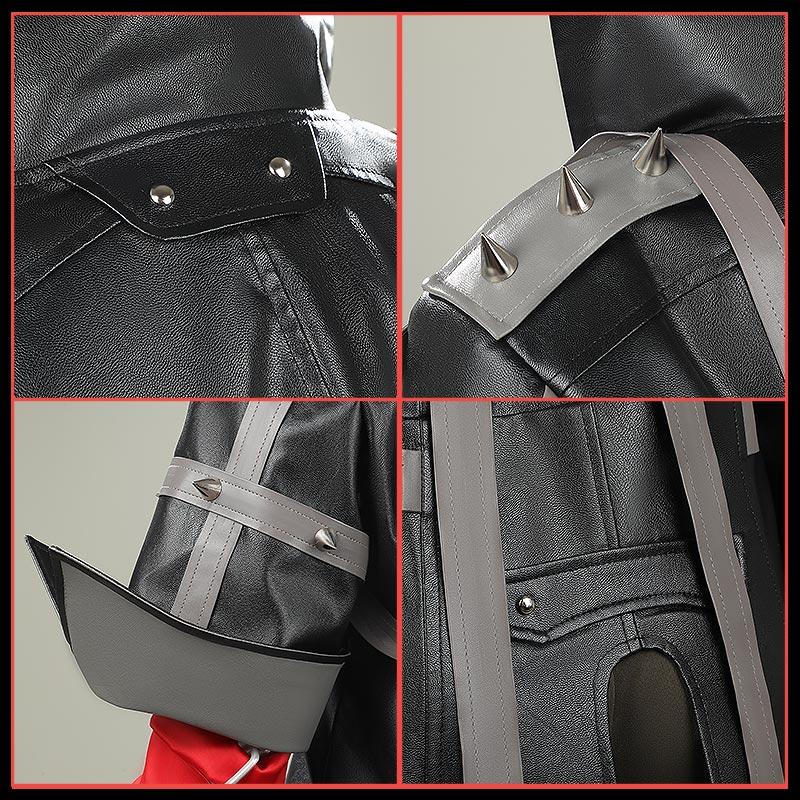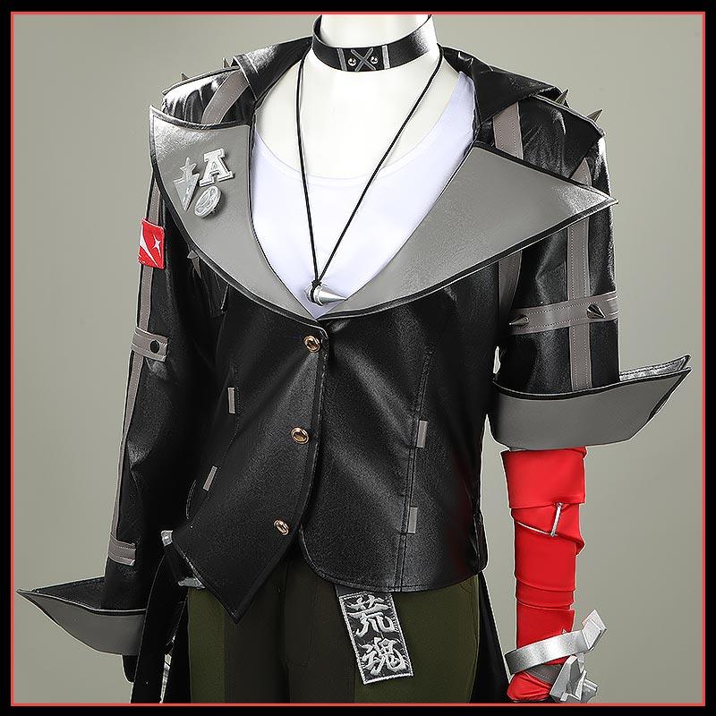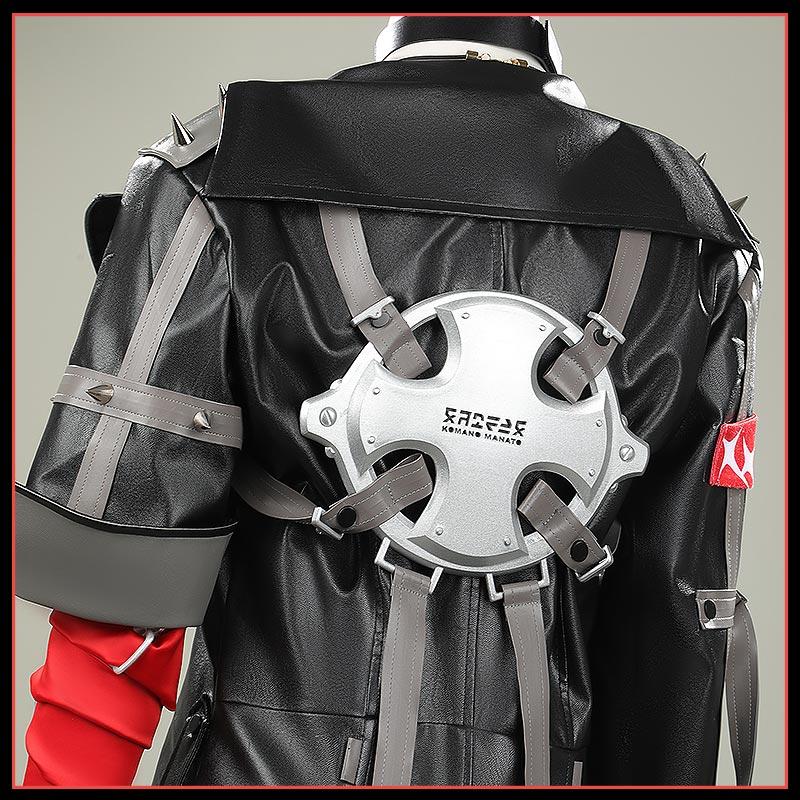 ウォッシュドレザーで製作しています。大きなグレーの襟と肩の鋭角的なエポーレット、背面には大型の円形メタルパーツが付き。全体的にミリタリー×サイバーパンクの雰囲気で、力強く威圧的なシルエットを演出します。