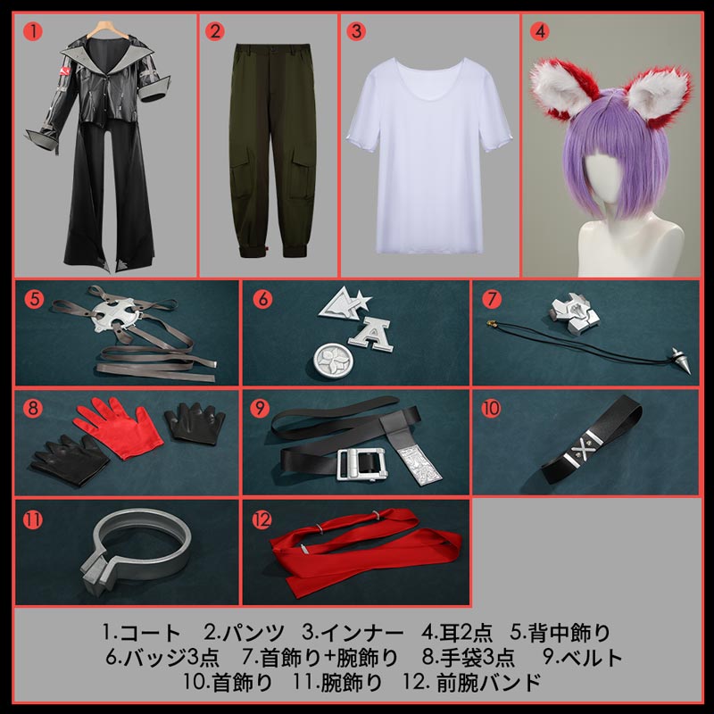 コ一ト、インナー、パンツ、飾り物(耳2点、肩飾り、バッジ3点、首飾り2点、腕飾り、背中飾り、ベルト、手袋3点、腕飾り、前腕バンド))