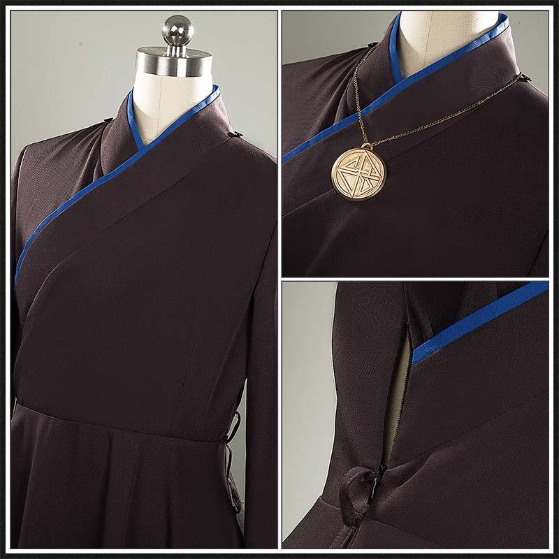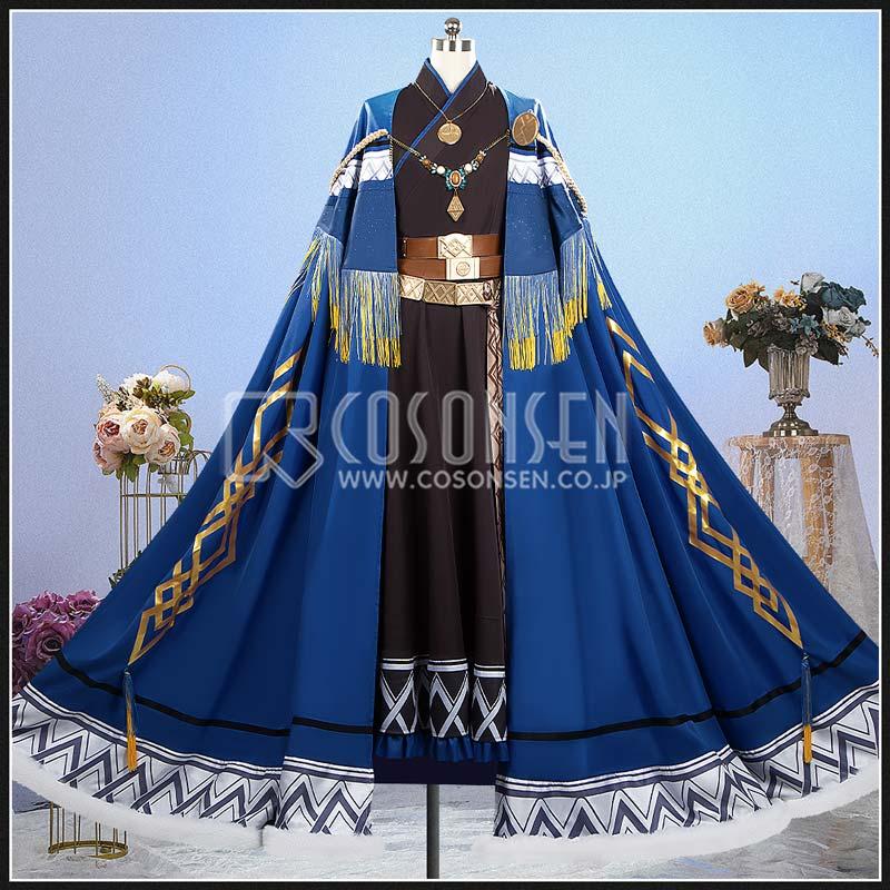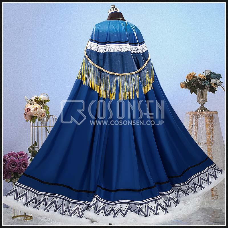 ポリエステルで製作しています。伝統的なチベット風やモンゴル風の民族衣装を思わせる優雅なシルエットが特徴で、袖口と裾には白と青のジグザグ模様の刺繍やプリントが入り、裾周りは青いフリルでアクセント。