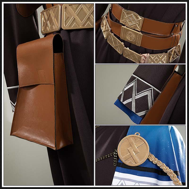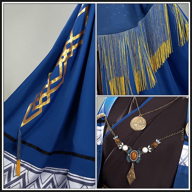 ポリエステルギャバで製作しています。肩部分から胸元にかけては白と青のストライプ柄が入り、縁取りには白地に黒と青のジグザグ模様がプリントされ、ファー調の柔らかなトリムが施されています。袖口や裾には金色の幾何学的な連鎖模様があしらわれ、豪奢さを強調。