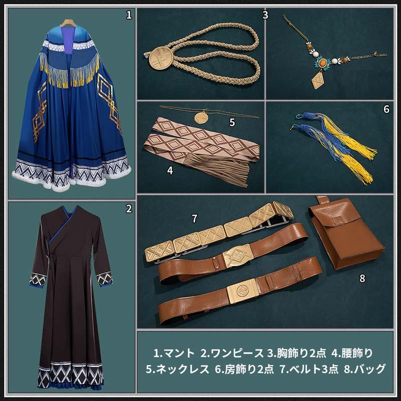 マント、ワンピース、飾り物(胸飾り2点、腰飾り、ネックレス、房飾り2点、ベルト3点、バッグ)
