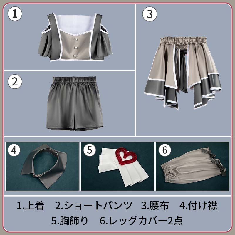 上着、ショートパンツ、腰布、飾りパーツ(胸飾り、つけ襟、レッグカバー2点)