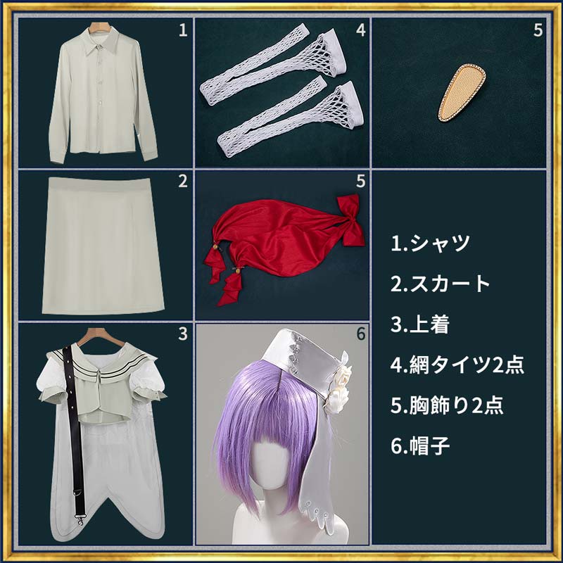 シャツ、スカート、上着、飾り物(綱タイツ2点、胸飾り2点、帽子)