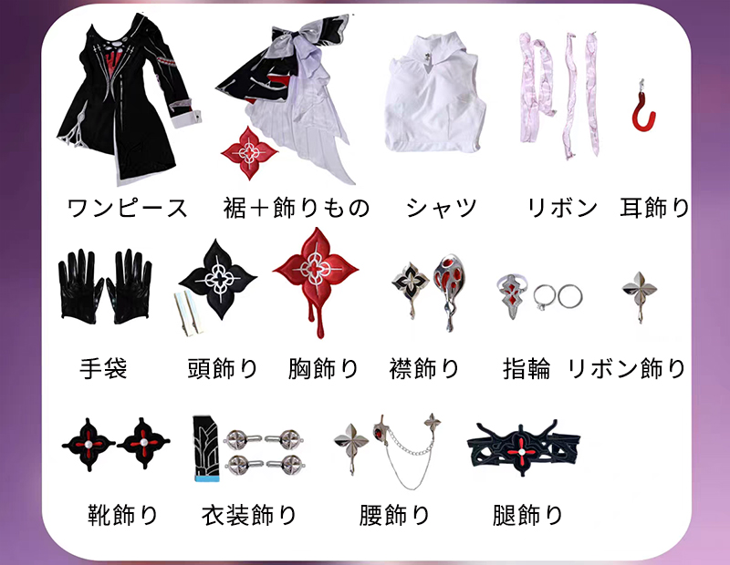 ワンピース、シャツ、飾り物(裾+飾りもの、リボン、耳飾り、手袋2点、頭飾り3点、胸飾り、襟飾り2点、指輪3点、リボン飾り、靴飾り2点、衣装飾り5点、腰飾り2点、腿飾り)