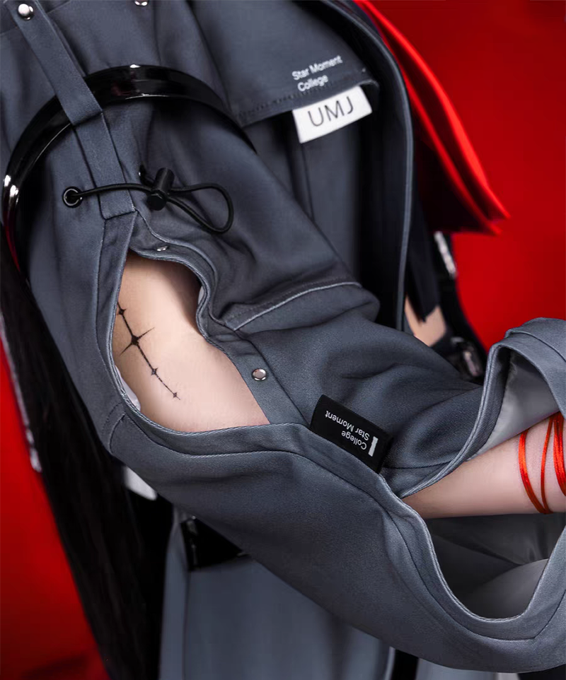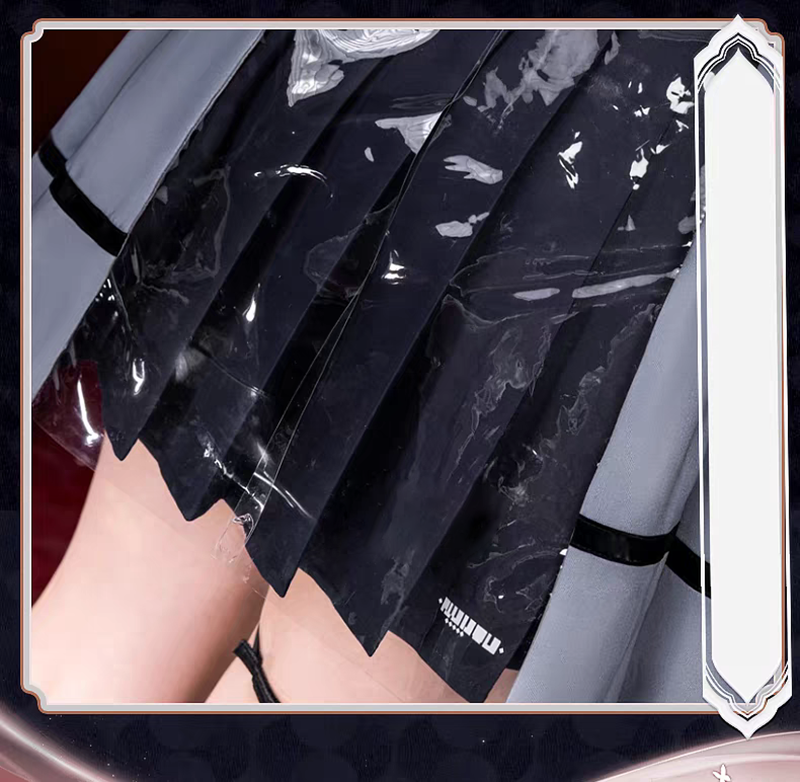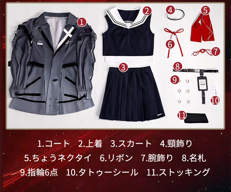 コート、上着、スカート、飾り物(頸飾り、蝶ネクタイ、リボン、腕飾り、名札、指輪6点、タトゥーシール、ストッキング)