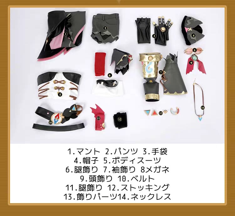 マント、パンツ、ボディスーツ、飾り物(手袋2点、帽子、腿飾り3点、袖飾り2点、、メガネ、頭飾り、ベルト2点、アームバンド、ストッキング、飾りパーツ4点、ネックレス)