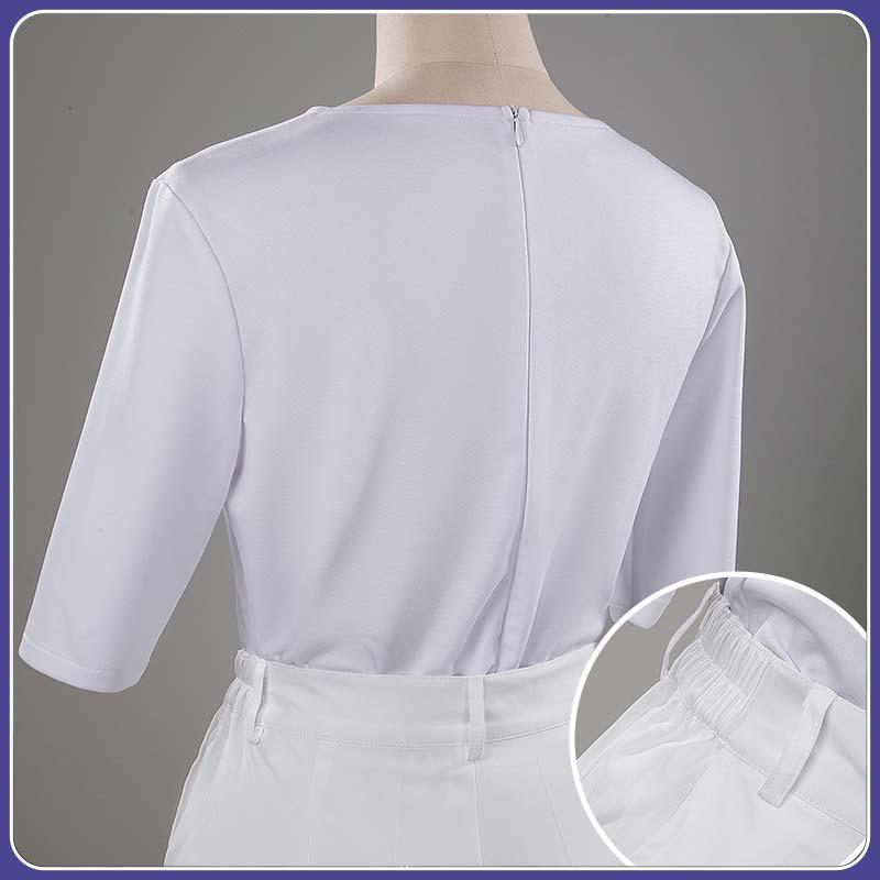 ニット生地で製作しています。ラウンドネック仕様で、後ろ中心に隠しファスナーを備え、着脱が容易な機能的なデザイン。