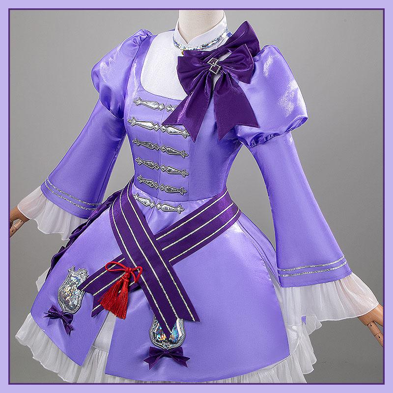 光沢サテンで製作しています。首周りには虹色に輝くホログラフィックトリムと金色のペンダント付きのチョーカーがアクセントとなり、エスト部分には金糸ストライプ入りの紫色ベルトをクロスさせて巻き、裾全体には多層の白いチュールフリルが重なり、軽やかで甘いシルエットを完成させています。