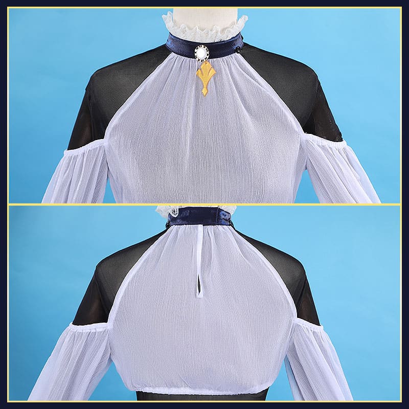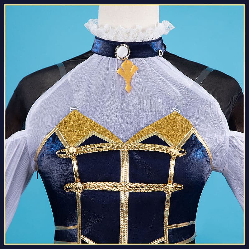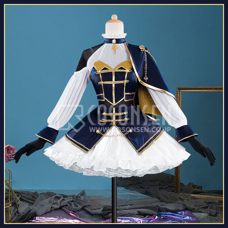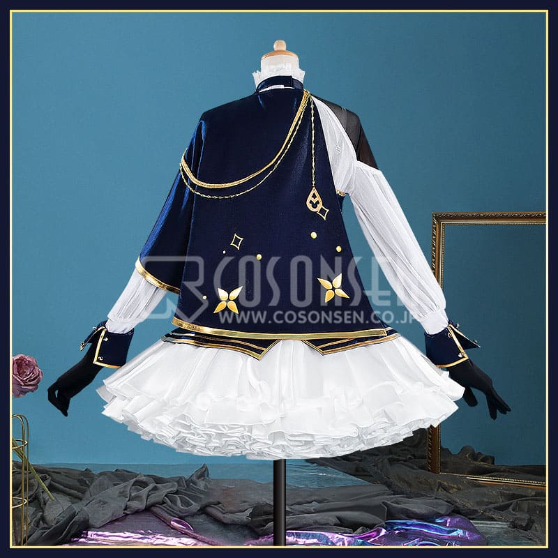 深い紺色のベルベットと純白のシフォン・フリルを基調とし、金色の刺繍や金属装飾をふんだんにあしらった、典雅で華やかな舞台衣装を忠実に再現しています。