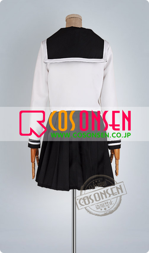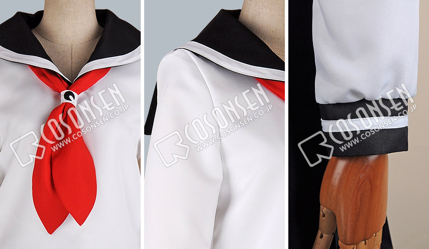 白と黒を基調したポリ混紡生地で制作します。襟は黒です。セーラー服の様式です。少女の甘さを上手に表現します。