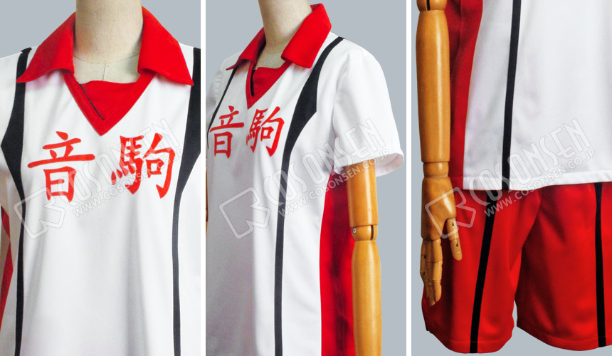 白い生地に黒い縞模様、脇以下は赤で、音駒の文字がプリントされています。