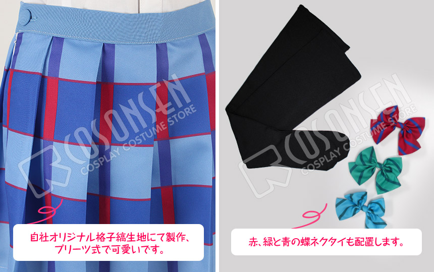 青を基調してポリ混紡生地にて製作します。裾はプリーツ式で、女性の魅力度を簡単にアップさせられる。自社オリジナル生地にて製作して、鮮やかで原作の再現です。