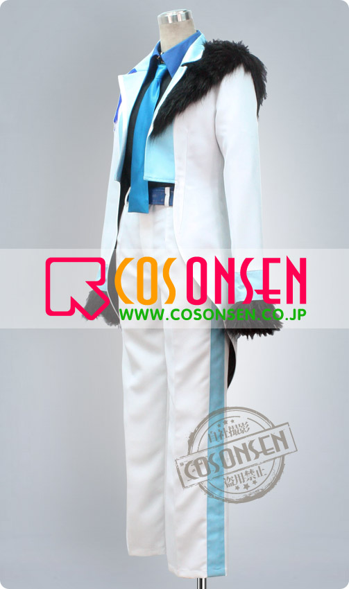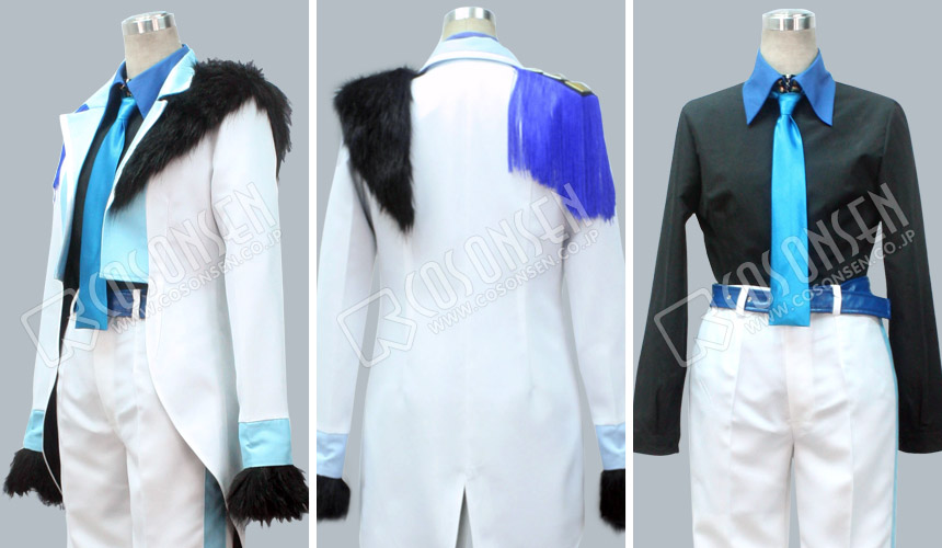 白と青を基調したポリ混紡生地で製作しています。左肩と両手の袖口は黒のフアーを付きます。右肩にブルーのフリンジ飾りを付きます。
