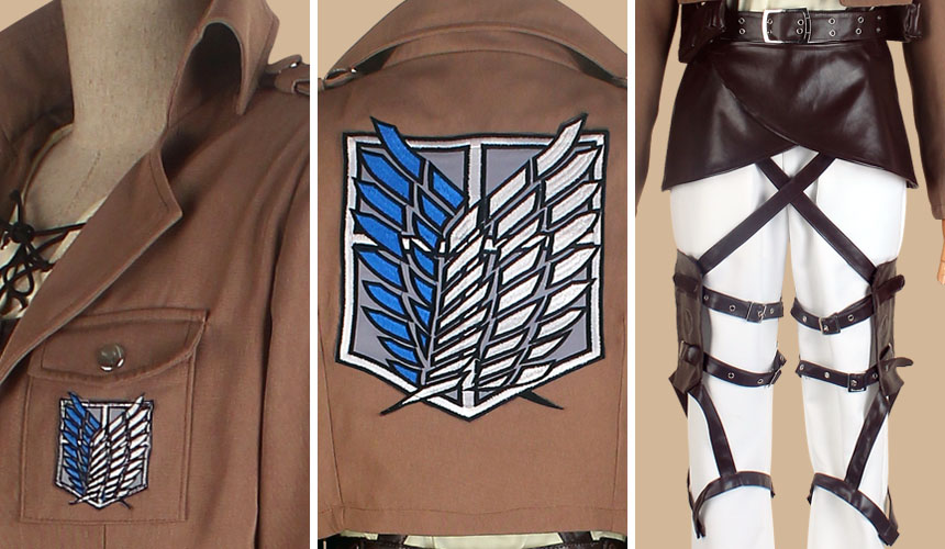 カーキ色を基調にした生地で、両腕と左胸と背中に調査兵団を象徴する模様が刺繍されています。