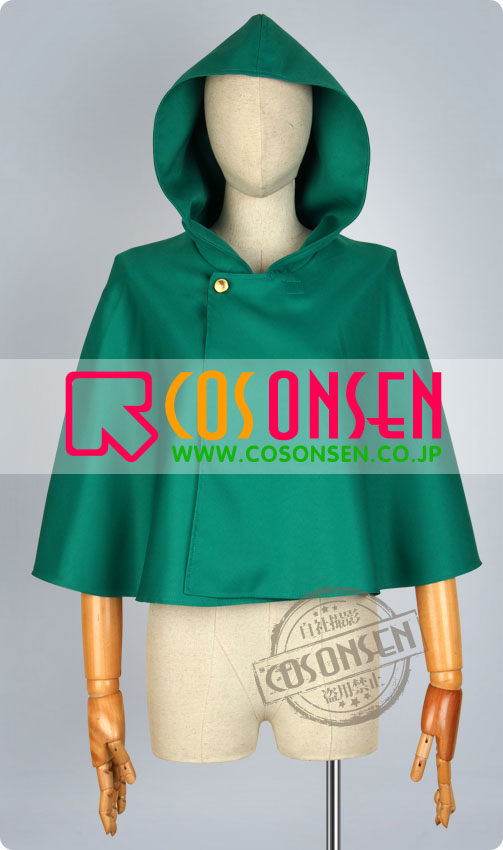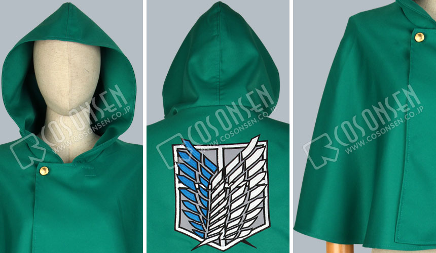緑を基調したサテン生地で製作します。帽子付き、背中に調査兵団を象徴する模様が刺繍されています。
