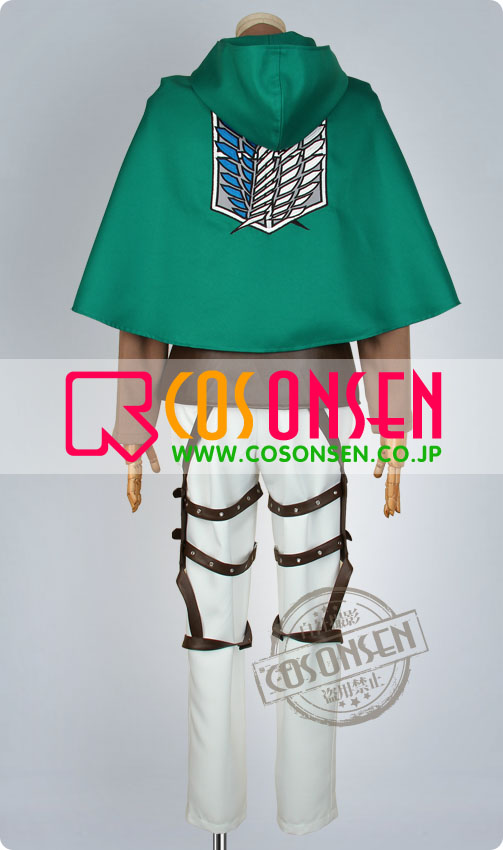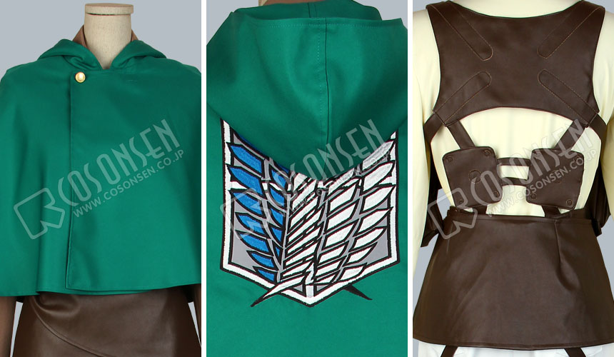 カーキ色を基調にしたぼり混紡生地で、両腕と左胸と背中に調査兵団を象徴する模様が刺繍されています。