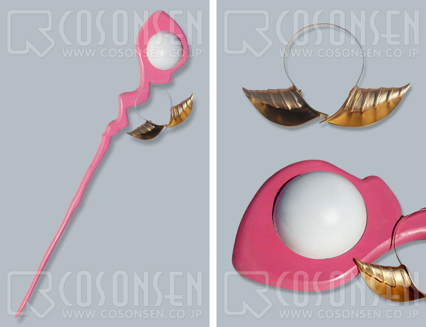 ★魔力を蓄えるホラ貝の形をしている装身具とピンク色の魔導杖です。