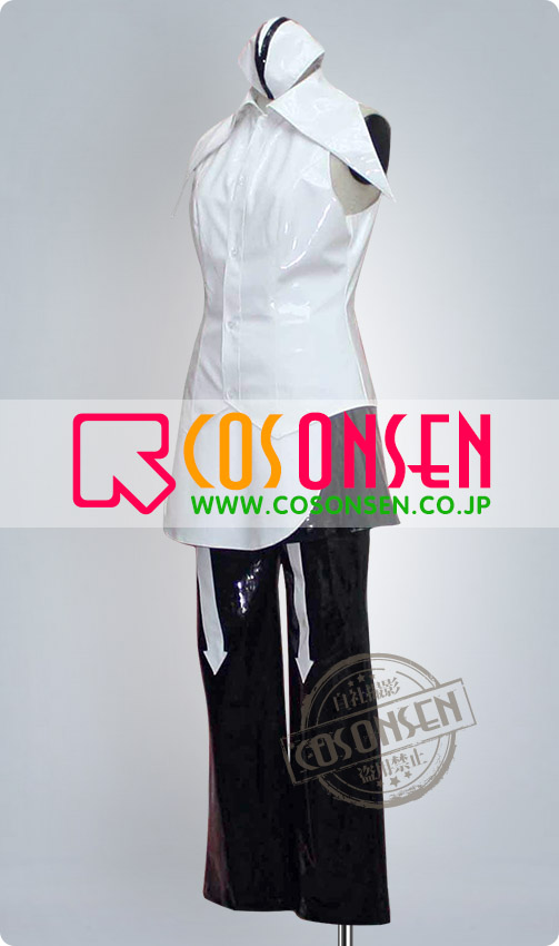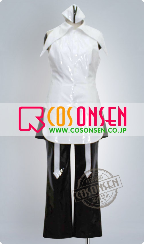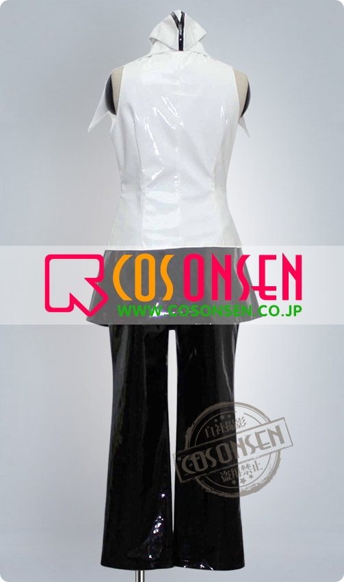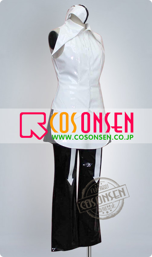 白を基調エナメル生地で製作します。袖なしです、襟の裁断は見どころです。ワンピース風で、後ろの裾は黒です。帽子付きます。