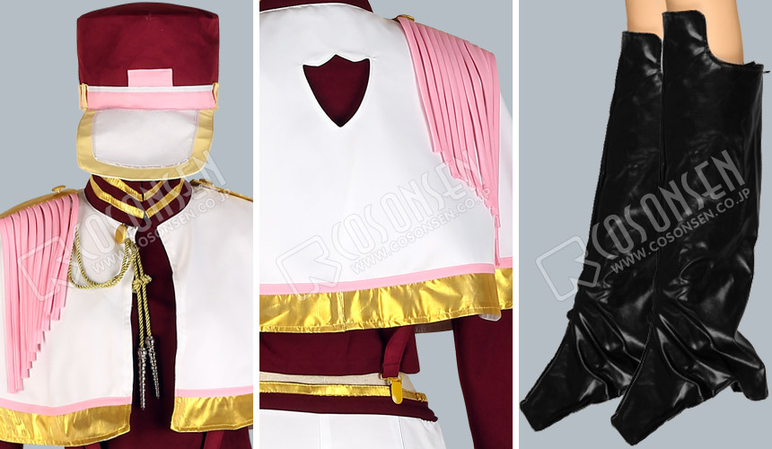 白い生地に金色の縁取りで、肩章にピンク色のフリンジが付いています。背中に特殊な模様の穴が空いています。