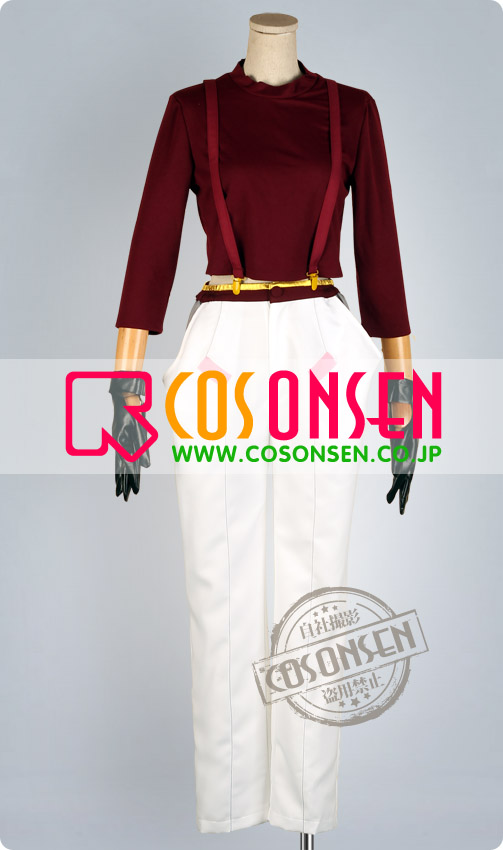 肩にかけて背中で交差するサスペンダーと腰に巻いている赤いプレーンベルトです。
