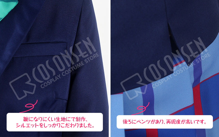 紺色の基調のポリ混紡生地で製作します。正面に金色のボタンが付きます。念入りな仕上げです。