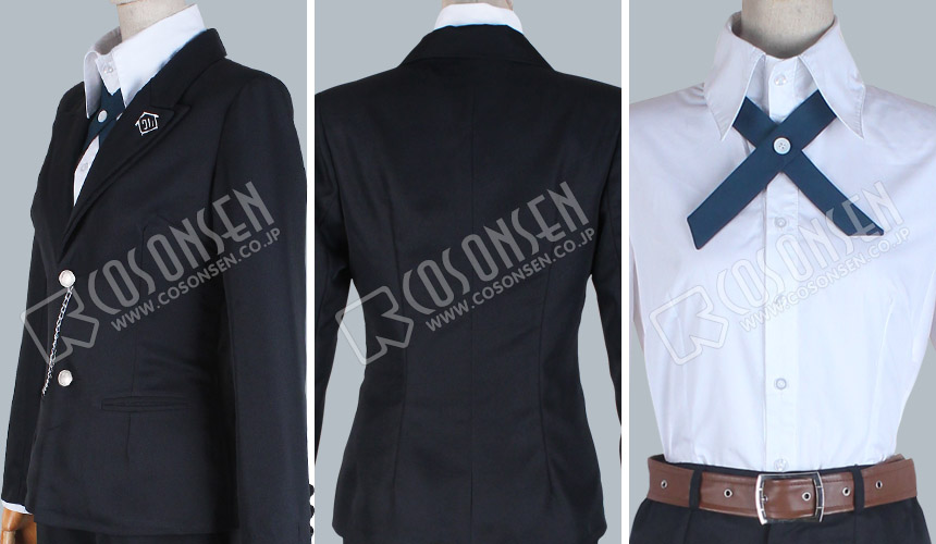黒を基調したぼり混紡生地で製作するスーツです。ボタンのところにチェーンを付き、高級感を求めるデザインです。襟に付いた徽章はPVC生地で製作します、原作とそっくりです。