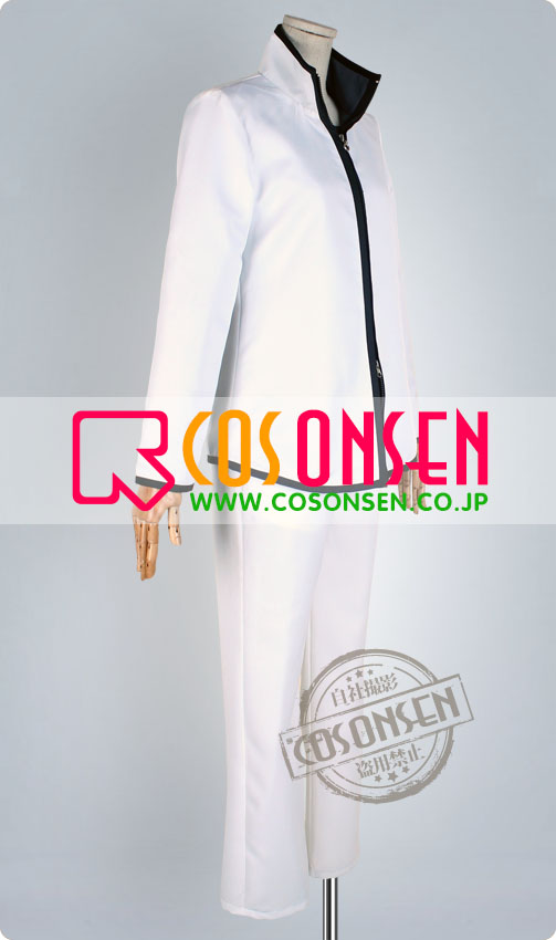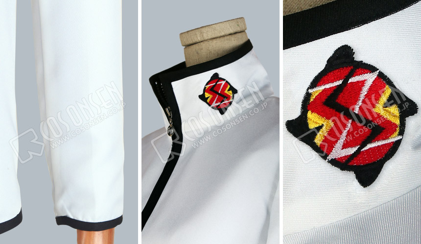 白を基調したジャージ専用生地で製作します。袖口と裾に黒いラインを付き、前身頃はチャック付きます。チャックは二個あり、上と下両方とも使います。襟に柄を刺繍しています。