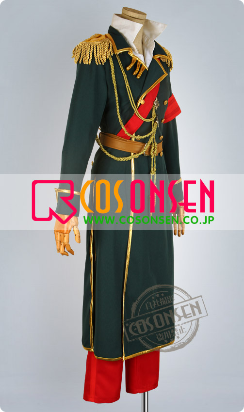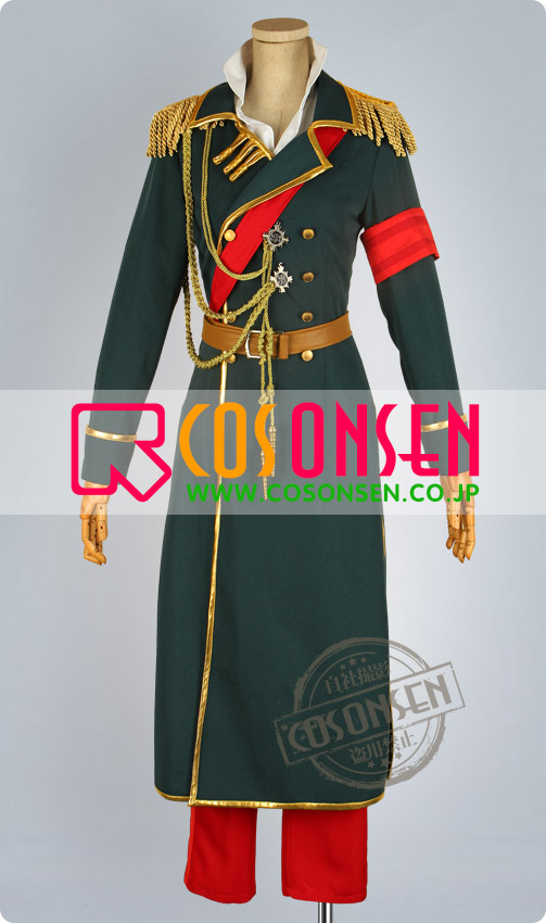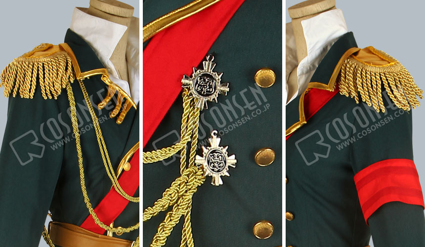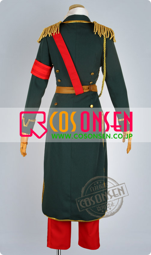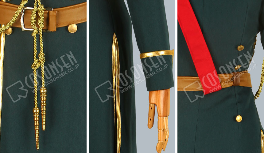 ダークグリーンと金色を基調にして、ボディラインを描くちょっと長いのコートです、肩のふさ飾りも赤い腕章も原作を完璧的に再現します。