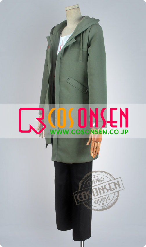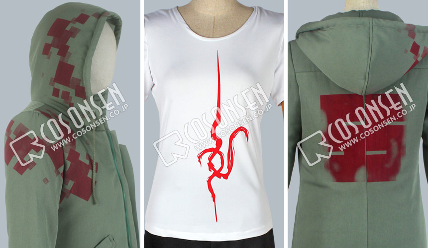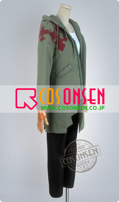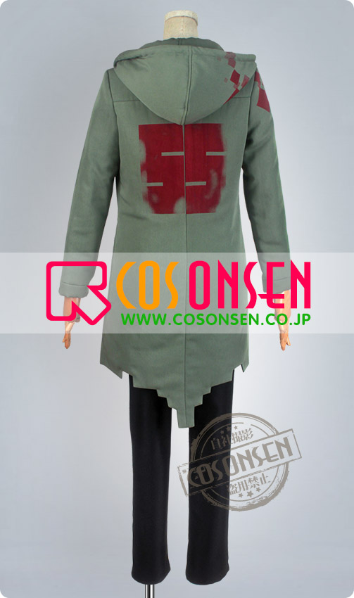 アーミーグリンを基調したボリ混紡生地で製作します。帽子付き、肩と背中に赤の柄をプリントしています。背中はSSの文字をプリントし、原作を完璧に再現しました。特に裾のデザインが見どころで、不規則の裁断がすごく魅力的です。