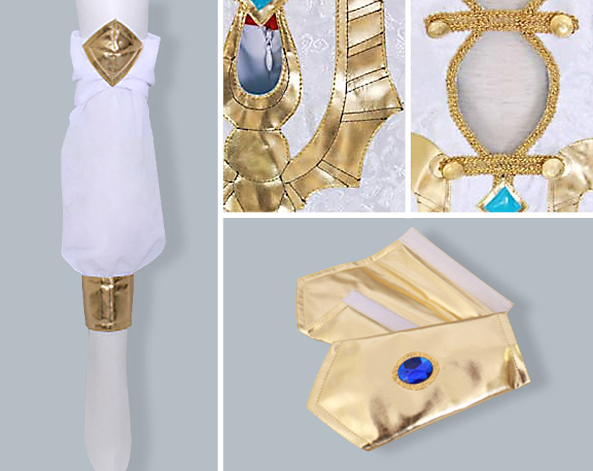 金色の合皮にて製作し。中心部分の飾りには青いアクリルストーンを使用しています。内側のマジックテープにて着脱していただきます。