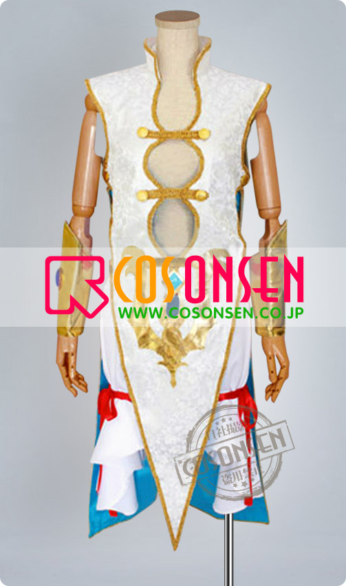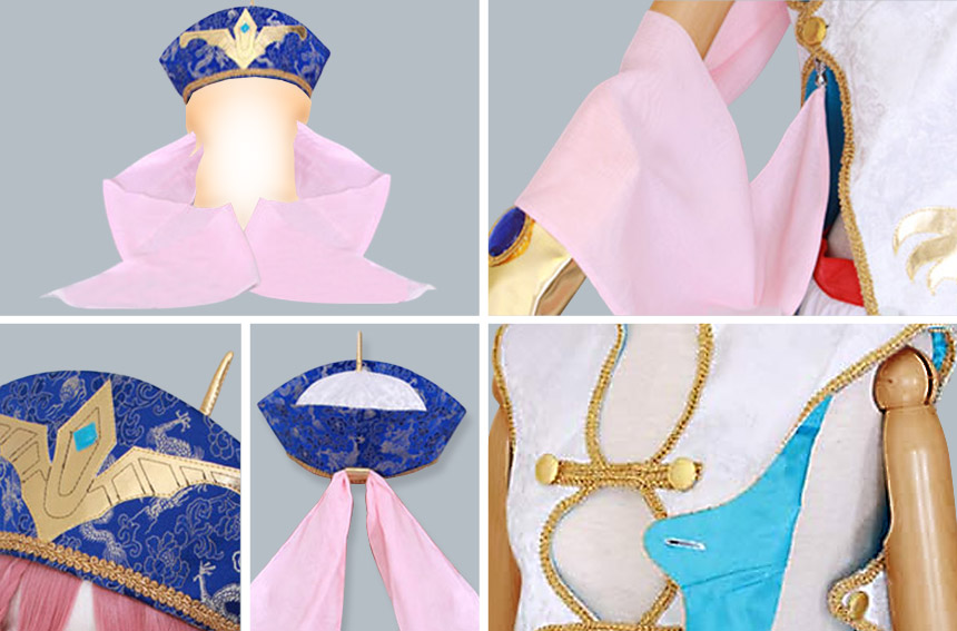 青と白のチャイナブロケードにて製作し。前中心の装飾は上着に同じく金色の合皮にて再現しています。後中心に薄ピンクのシフォン生地で出来た飾り布が付けてありますので、その先端に付いているフックを上着の脇ボタンに引っ掛けてご着用下さい。