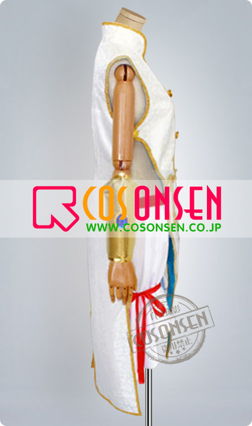 白いサテン生地にて製作し。前中心のボタンとファスナーにて着脱してます。裾フリルの独特な形状は元絵を忠実に再現しました。裾には少し緩めにゴムシャーリングが入れてありますので、サテンリボンを結ぶ際にご自身に合った裾幅に調整してご着用下さい。