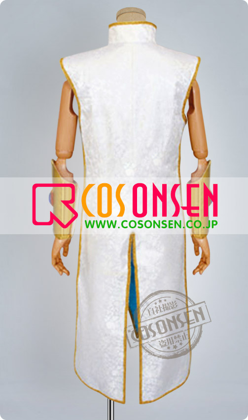白いチャイナブロケードにて製作し。両脇のボタンにて着脱してます。裏地には水色のサテンを使用し。縁取りのラインには金色のブレードを使用し全体的に高級感のある仕上がりとなっています。コウモリモチーフの装飾は金色の合皮を使用し再現しました。