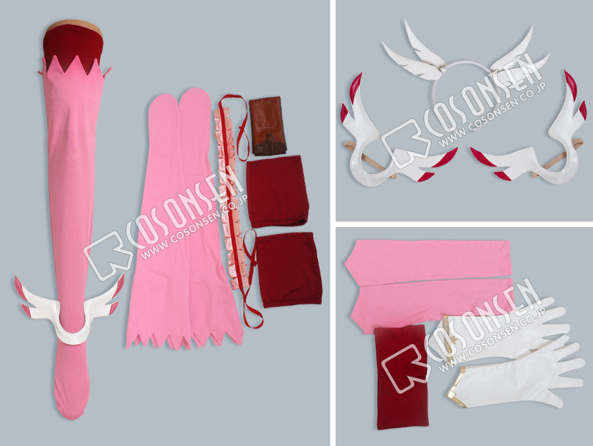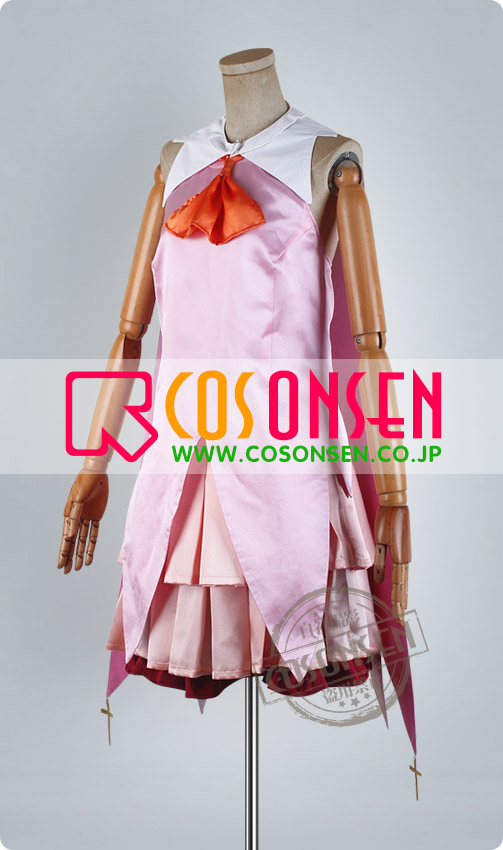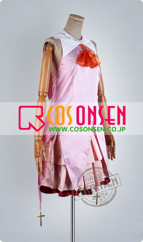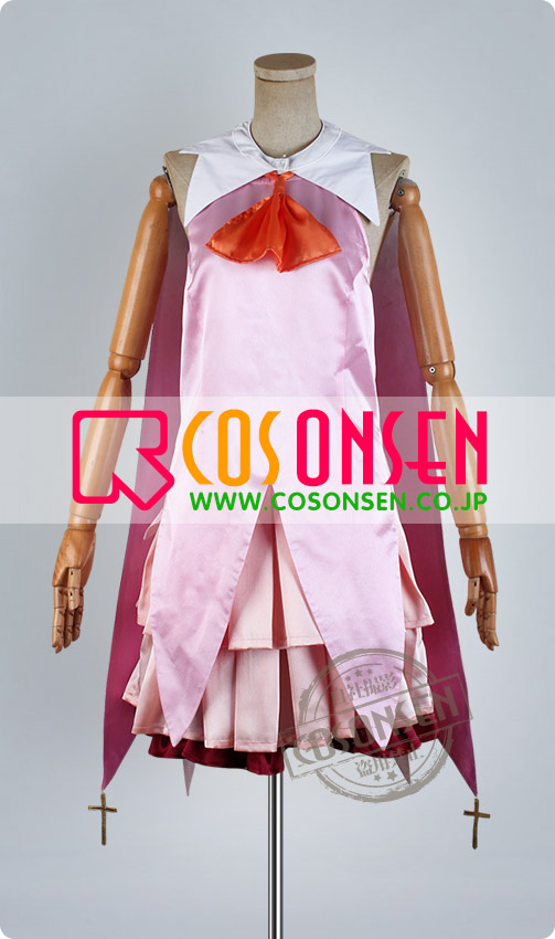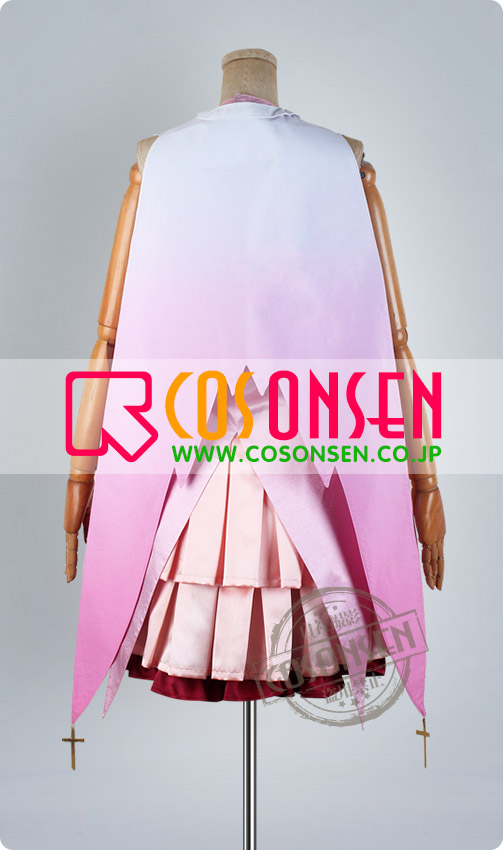 白とピンクのグラデーションを基調したボリ混紡生地で製作します。裾の部位はワンピースと同じように燕尾模様に裁断して、十字の飾りを付きます。原作を完璧に再現しました。