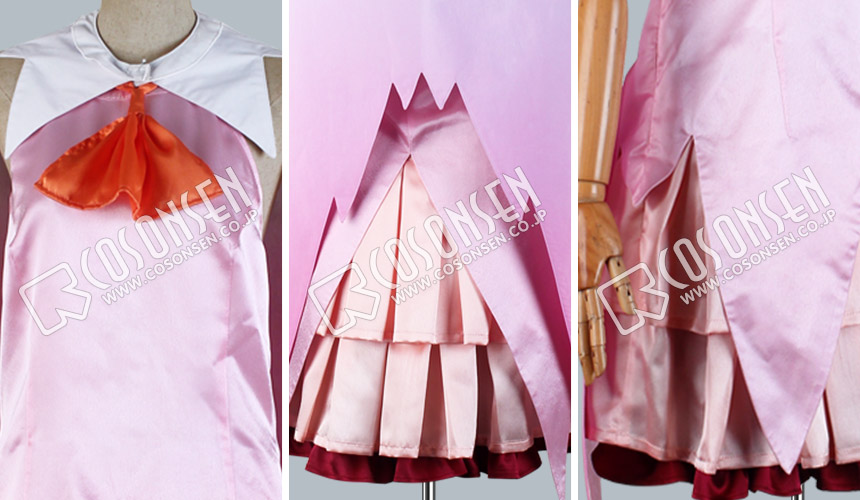 淡いピンクを基調したサテン生地で製作します。肩の部位は白で、オレンジ色のリボンを付きます。裾は燕尾のように裁断して、とても綺麗です。特に正面は下のスカートを若干露出して、重ねた裾は華やかな感じが出ます。