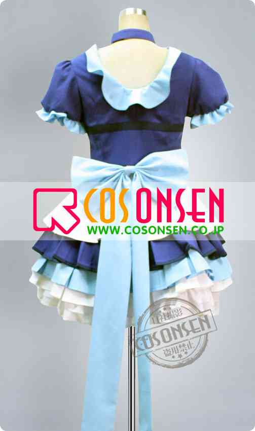 青を基調したポリ混紡で製作しました。裾はフリルスカートのような式になっています。後ろには長いリボンを付きます。とても可愛らしく仕上げました。