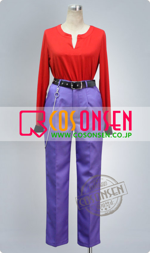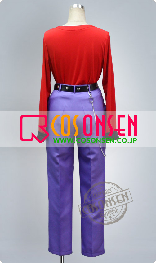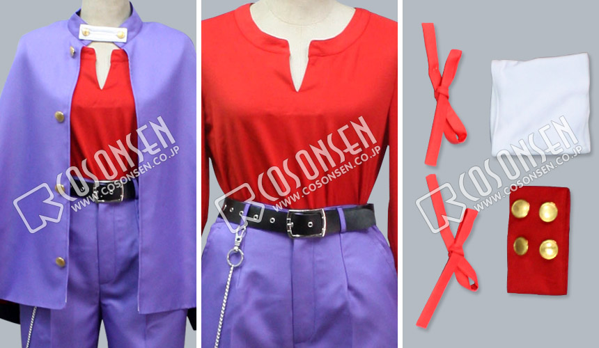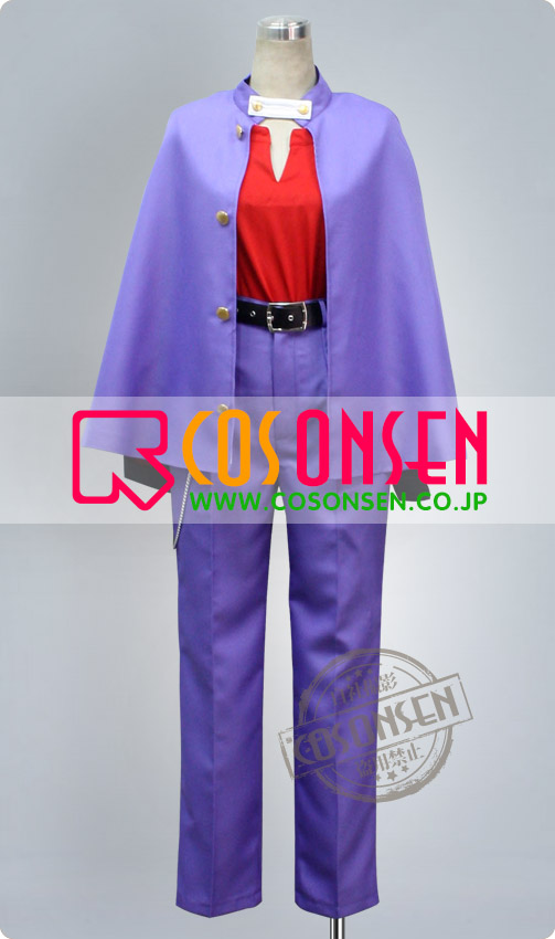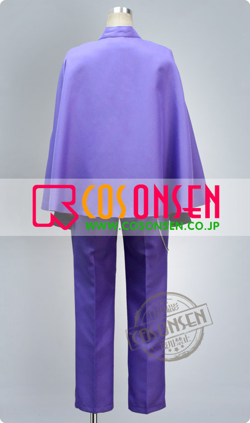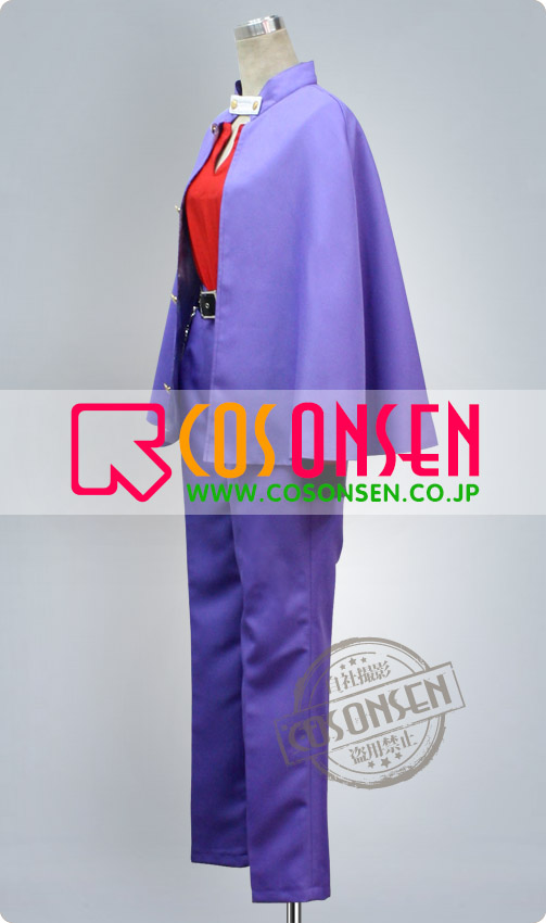 紫を基調したポリ混紡生地にて製作します。前身ごろの平ボタンは飾りです。正面のボダンにて脱着して頂きます。マントのようなデザインは原作に忠実します。