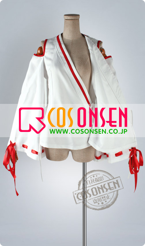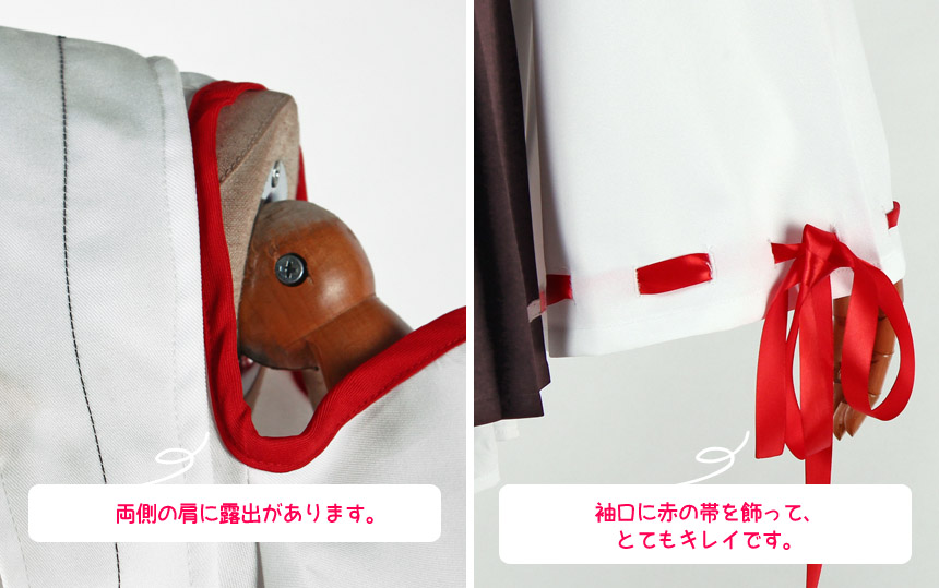 白を基調したポリ混紡生地にて製作します。肩の部位に露出があり、若干着物風です。袖口に赤のサテン帯が飾ります。