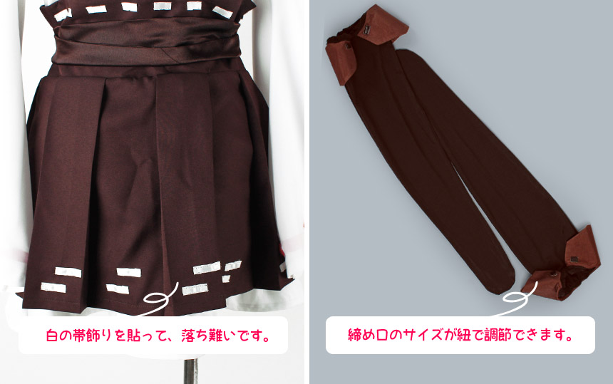 小豆色を基調したポリ混紡生地にて製作します。裾と腰周りに白の帯が貼ります。下にフリルが付きます。