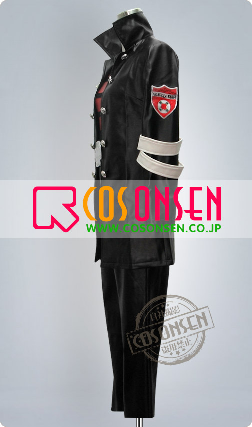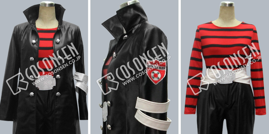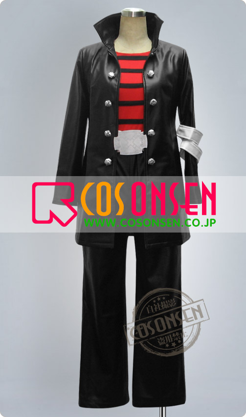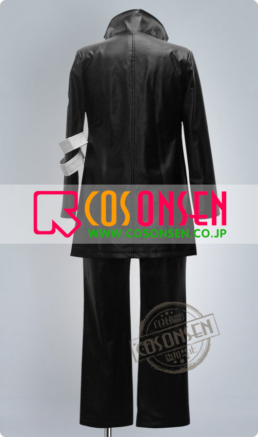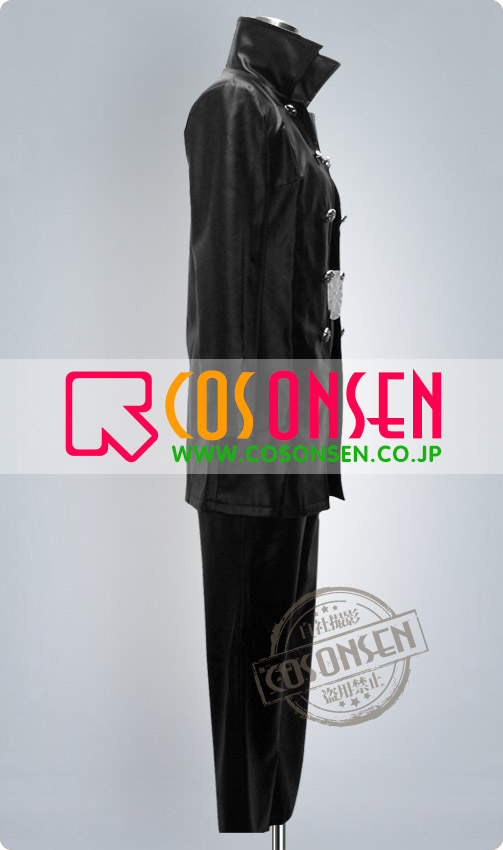 黒を基調した合皮生地にて製作します。正面に銀色のボダンが飾って、原作に再現される服飾りと徽章も取り付きます。
