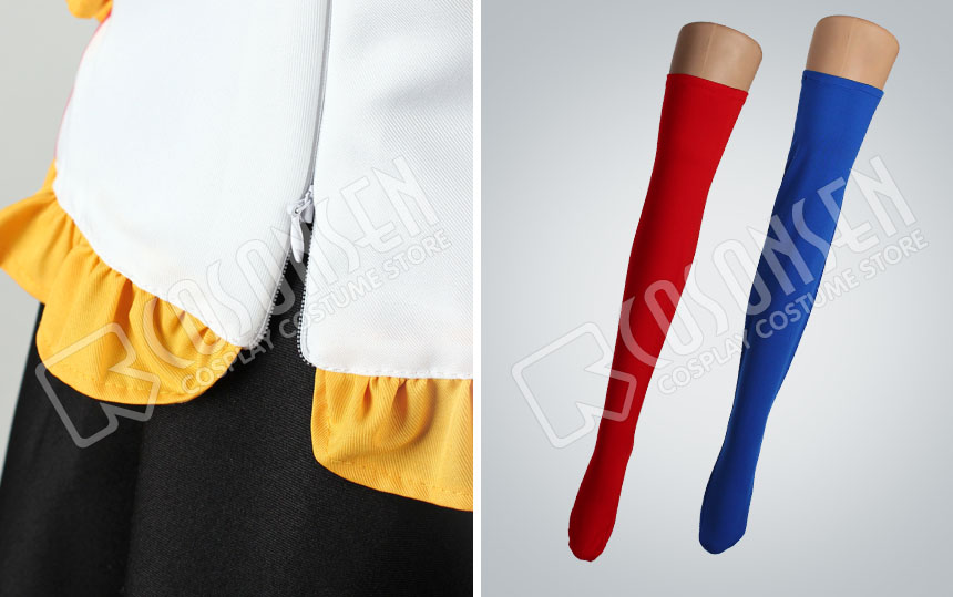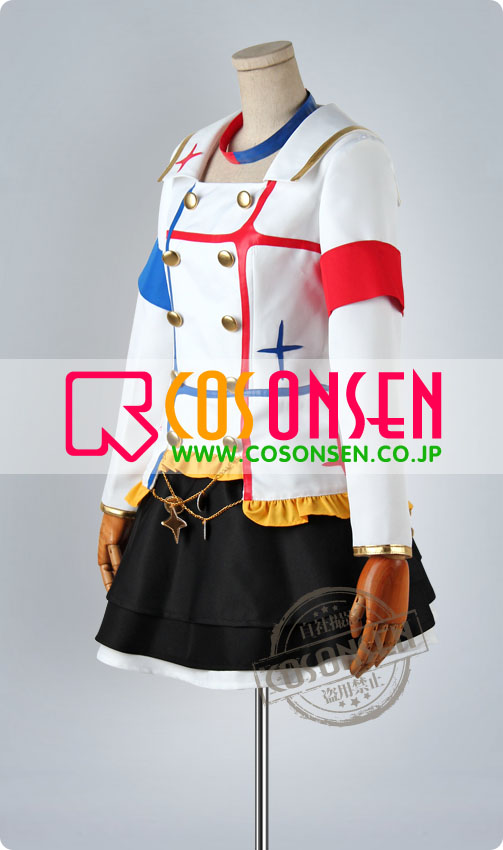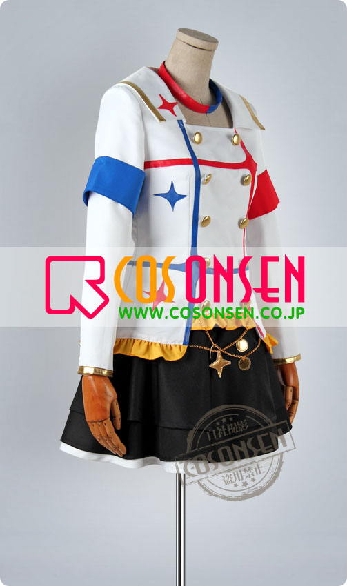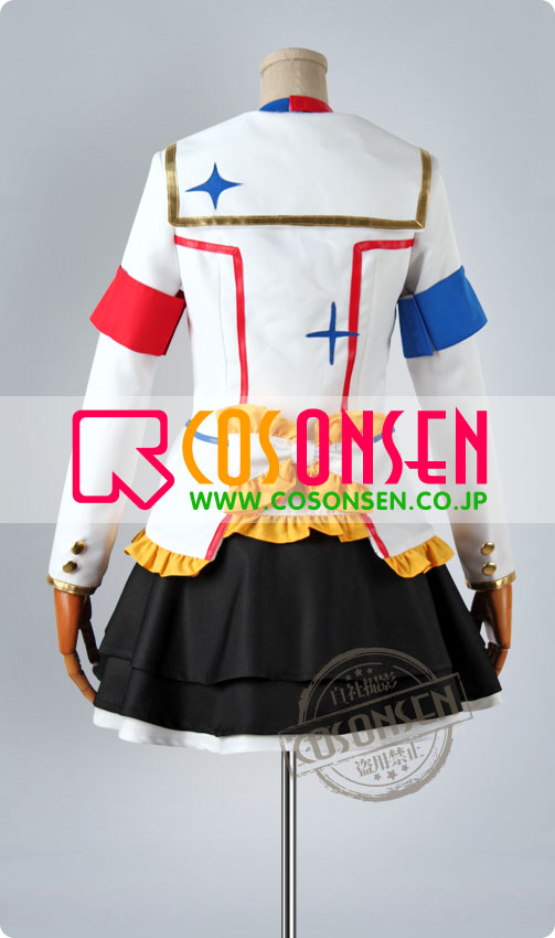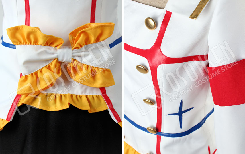 白を基調したポリ混紡生地にて製作します。前身頃に両列のボタンが付き、襟に金色の縁取りが入ってます。腕章2つが付き、裾に綺麗な黄色のフリルが飾ってます。