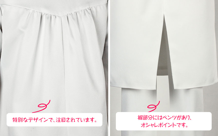 白を基調したポリ混紡生地にて製作します。正面のボタンとファスナーで着脱して頂きます。上着と同じようにピンクの裾が付きます。